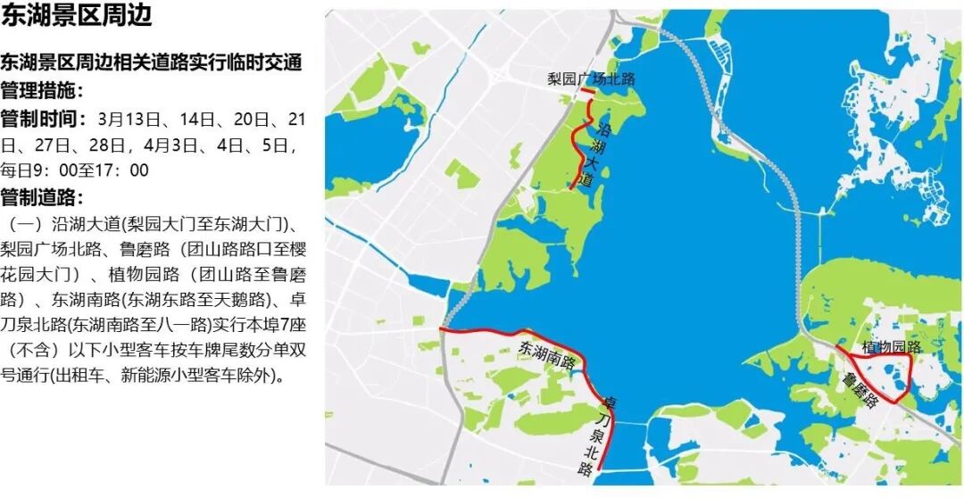 3月13日、14日、20日、21日、27日、28日,4月3日、4日、5日,每日9:00—17:00,东湖风景区周边相关道路实行临时交通管理措施。