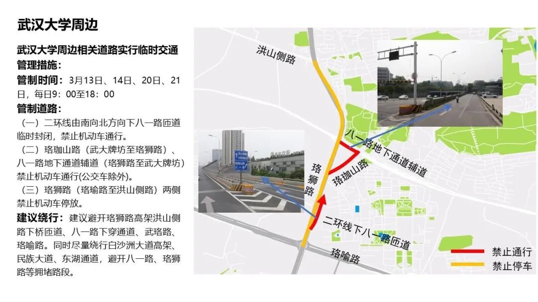 3月13日、14日、20日、21日,每日9:00—18:00,武汉大学周边相关道路实行临时交通管理措施。