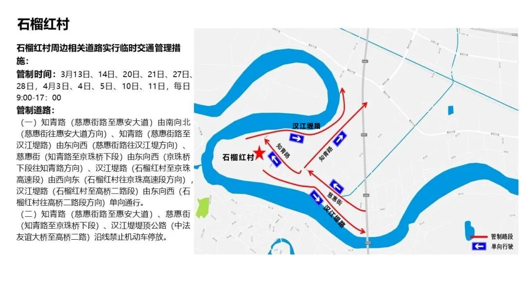 3月13日、14日、20日、21日、27日、28日,4月3日、4日、5日、10日、11日,每日9:00—17:00,石榴红村、郁金香主题公园周边相关道路实行临时交通管理措施。