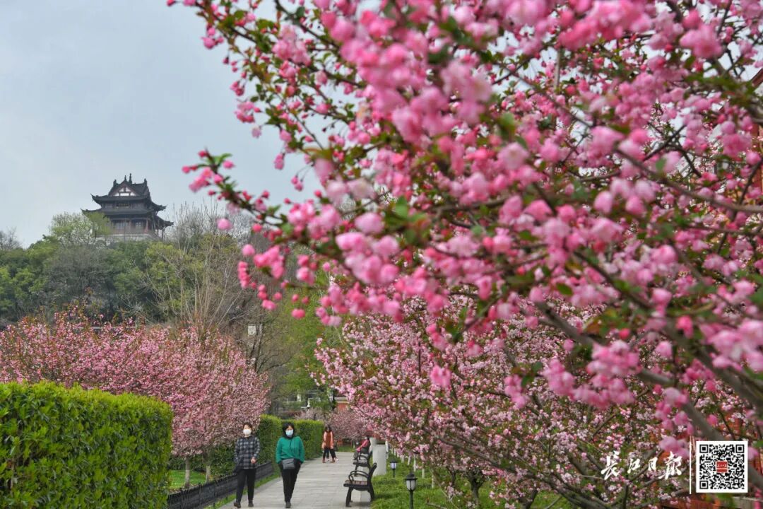 11日,武昌首义文化广场,雨后盛开的垂丝海棠愈加娇艳,吸引市民游客驻足欣赏。记者苗剑 摄
