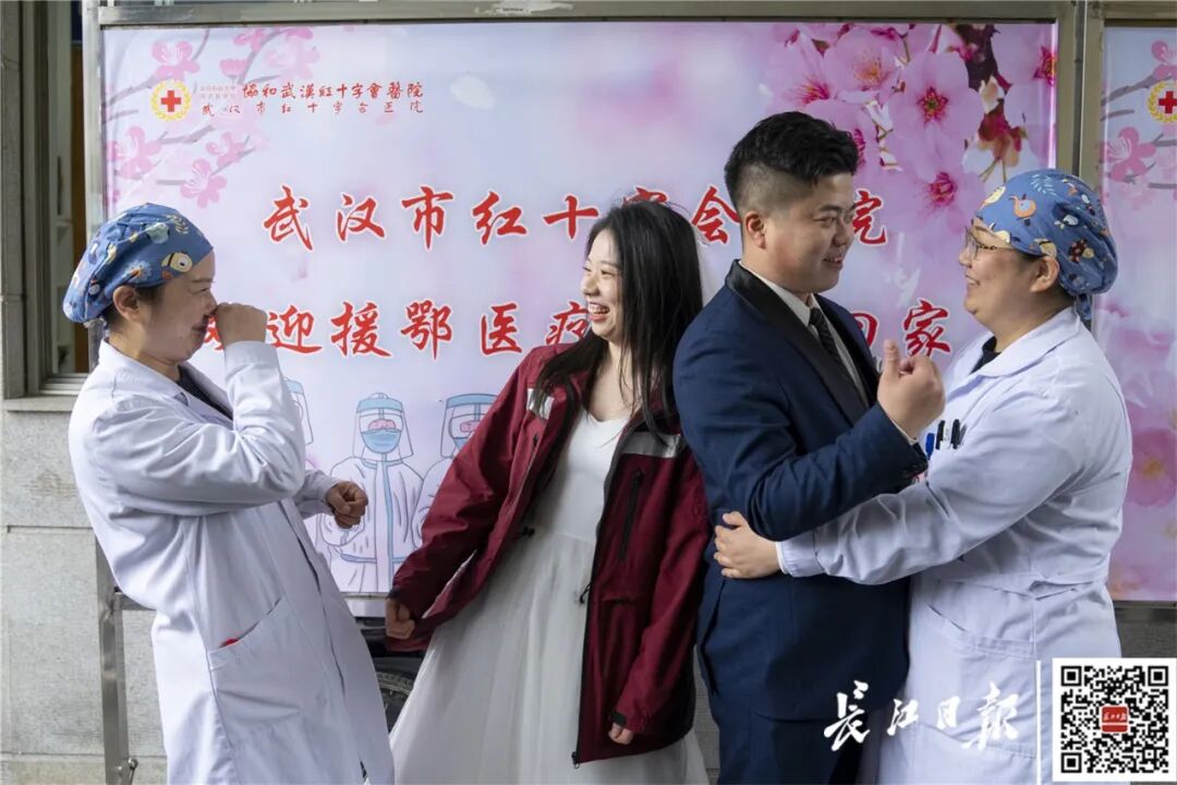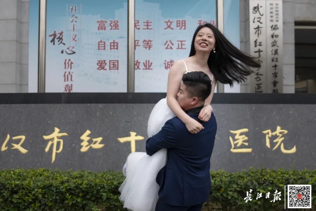 许秋英与彭宇牵挂武汉许久,今年3月,湖北发出邀请,欢迎援鄂医疗队回汉赏花。两人所在的四川省第二批援鄂医疗队也收到邀请,两人不约而同地提议,“回武汉拍婚纱照吧!”