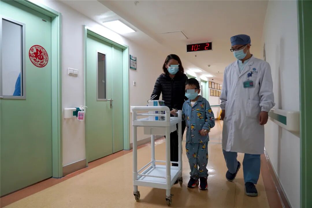 患者小凡凡在病房里散步。