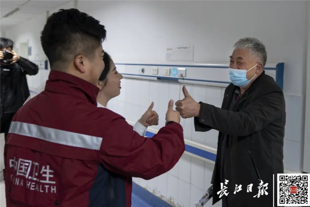 得知是援鄂医疗队队员回到医院拍照,患者家属刘爹爹走上前,竖起大拇指说,“欢迎英雄回来,为你们点赞,谢谢你们!”