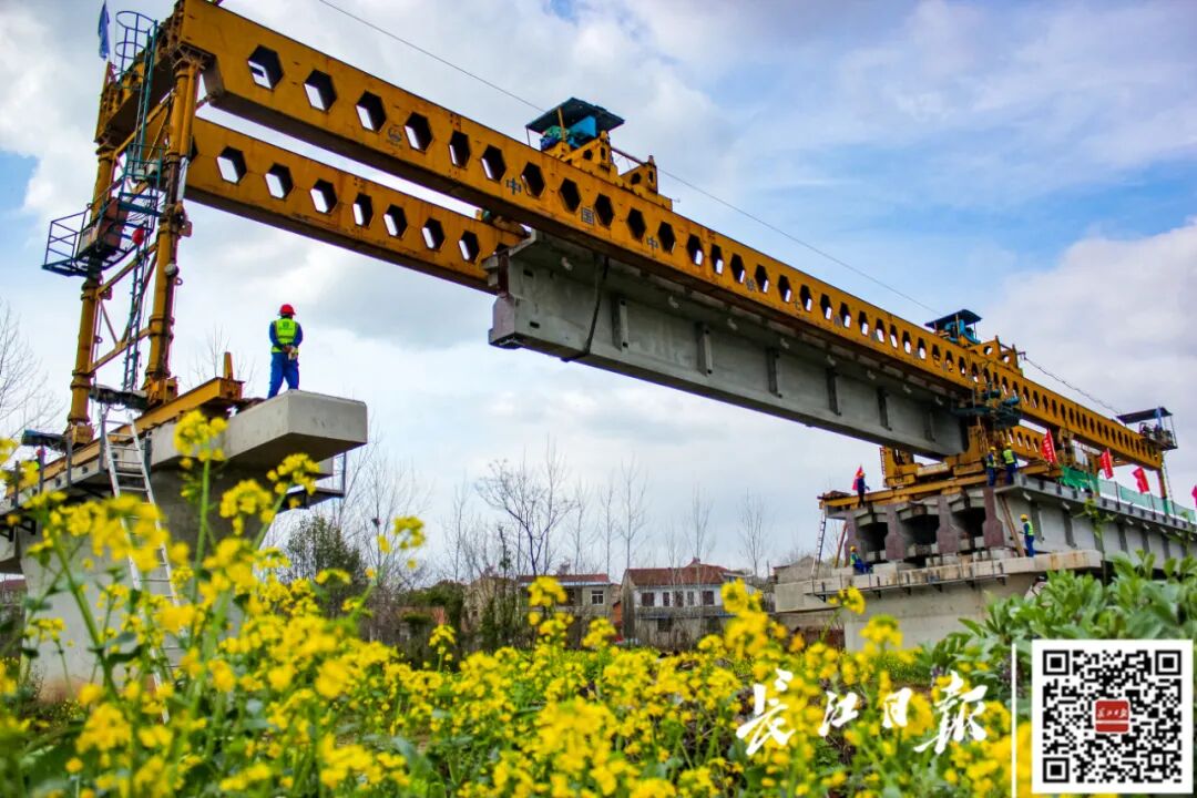 ◇ 在武汉新港江北铁路倒水河特大桥架梁施工现场,施工人员正加紧进行架梁施工,预计今年8月前能完成倒水河特大桥架梁施工。