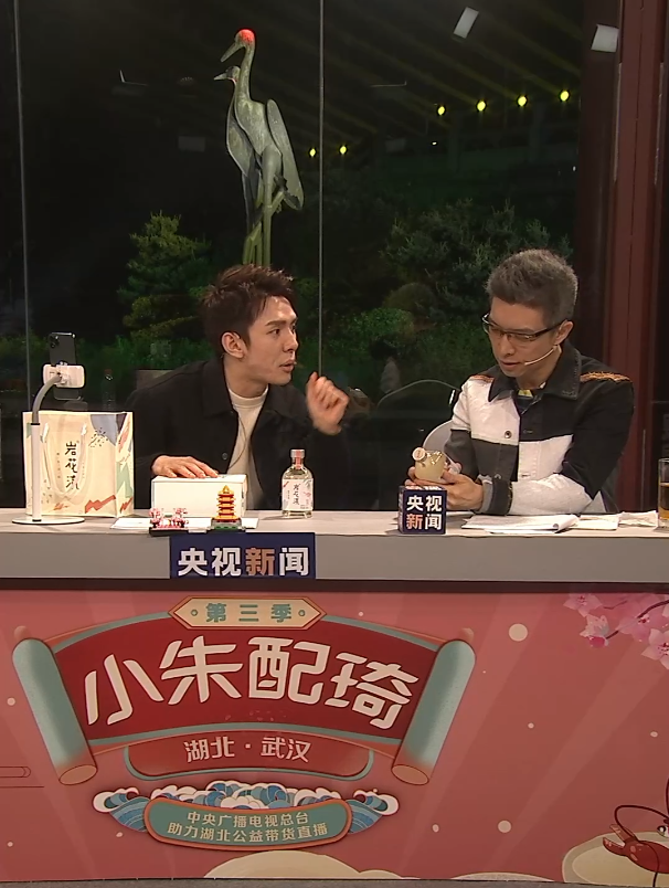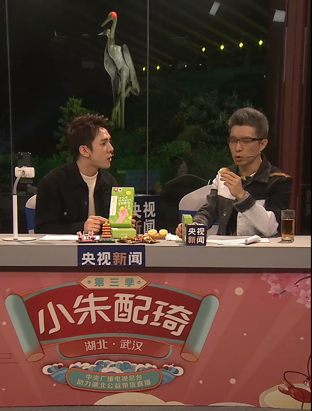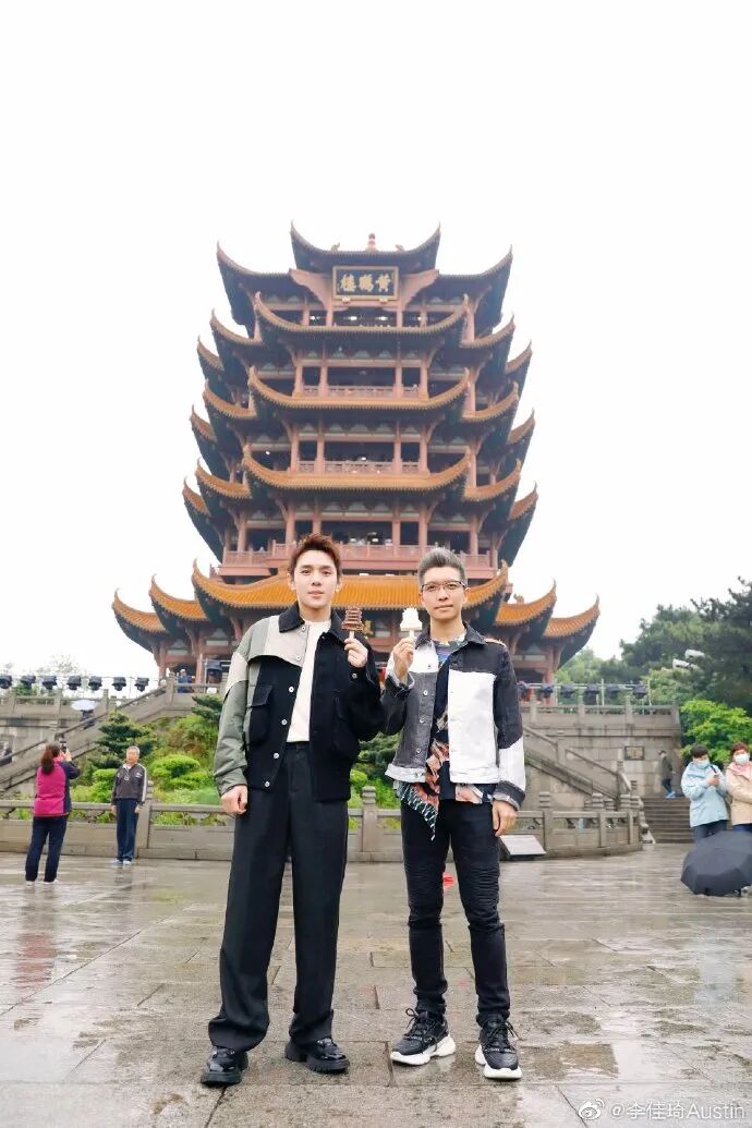 李佳琦(左)、朱广权(右)手拿黄鹤楼雪糕在黄鹤楼脚下合影。图片来自李佳琦微博
