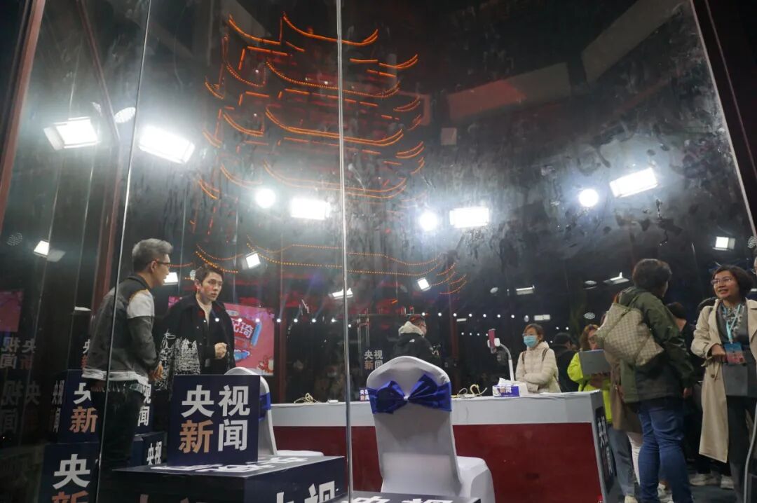 “小朱配琦”在黄鹤楼脚下透明直播间为湖北公益直播带货做准备。记者张珺摄
