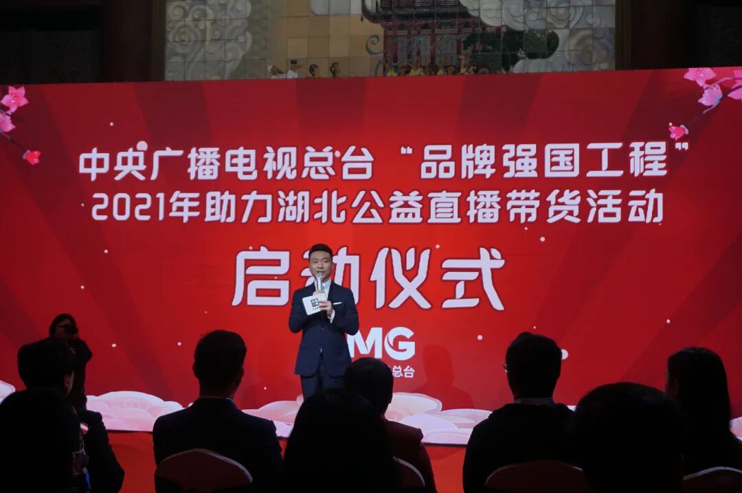 康辉在黄鹤楼一楼大厅宣布央视总台“品牌强国工程”2021年助力湖北公益直播带货活动启动。记者张珺摄