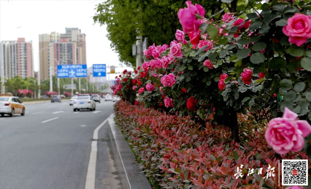 23日,武汉天气晴朗,金桥大道道路两旁大红色和粉色双色月季花盛放,吸引不少路人目光。记者杨涛 摄