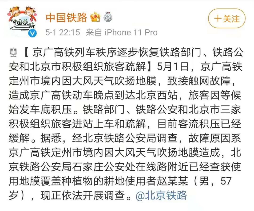 5月1日,京广高铁定州市境内因大风天气吹扬地膜,致接触网故障,造成京广高铁动车晚点到达北京西站,旅客因等候始发车底积压。铁路部门、铁路公安和北京市三家积极组织旅客进站上车和疏解,目前客流积压已经缓解。