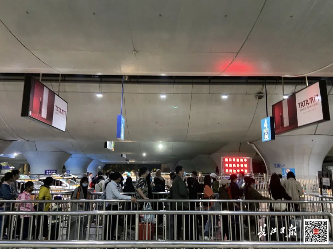虽然是凌晨,但武汉站还是有不少乘红眼高铁的或者晚点的旅客抵达,旅客的接驳比较顺利。在出租车上客点,旅客有序排队乘车,出租车一辆接一辆地运送,很快长队就慢慢变短。