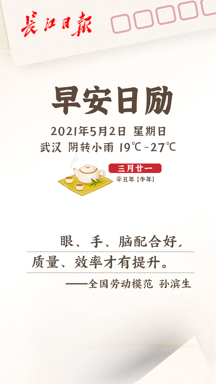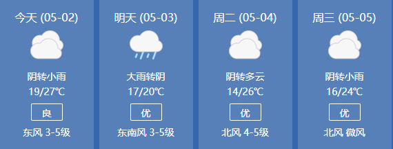 今天是“五一”假期天气的转折点:武汉市白天多云天气,夜间到后天,将会有大雨,北风增大,伴随有雷电,请大家做好防范。