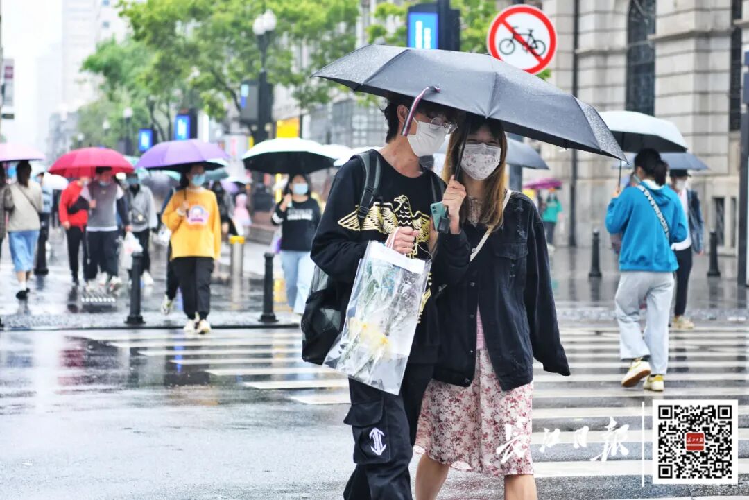 4月24日,江汉路步行街上,市民游客在淅淅沥沥的春雨中漫步逛街。记者苗剑 摄