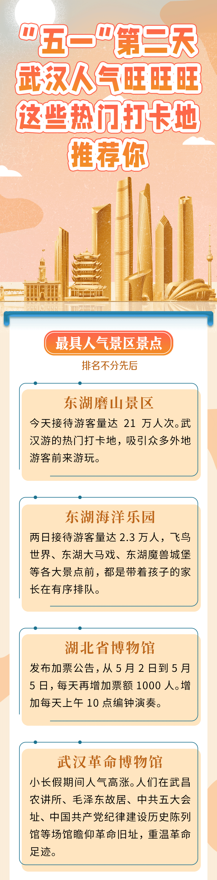 2日,武汉旅游热度爆表,各大景区人流如织,黄鹤楼公园连发两次客流量预警。该园表示,共有1.5万人预约了5月3日的游园,加上天气预报有雨,预计3日入园游客量会回落。详见>>>