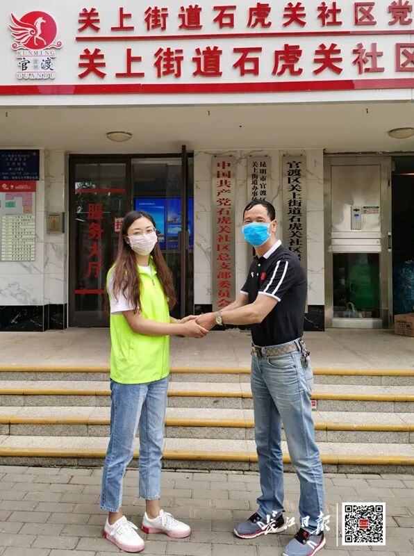 图为武汉人易双阳与昆明市官渡区石虎关社区工作人员。(本人供图)