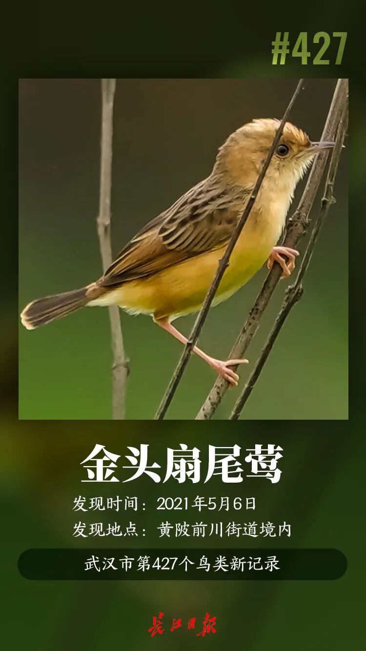 近日,鸟友卢群在黄陂前川街道境内观测并拍摄到的金头扇尾莺,被认定为武汉市第427个鸟类新记录,这也是今年产生的第6个鸟类新记录!详见>>>