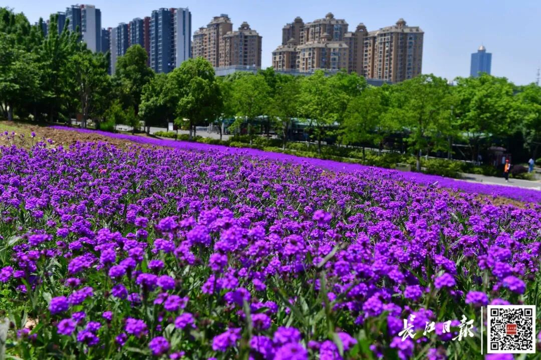 8日,武汉园博园内,随处可见成片盛开的花,图为矮生马鞭草花海。记者李永刚 摄