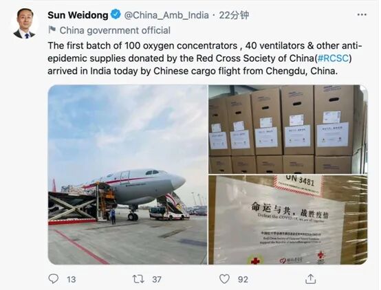 中国驻印度大使孙卫东在社交媒体上称,中国红十字会捐赠的首批100台制氧机、40台呼吸机以及其他防疫物资,已由中国货机从成都运抵印度。