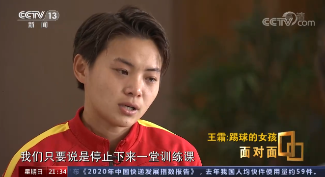 5月9日,央视《面对面》播出《王霜:踢球的女孩》,专访王霜近19分钟。王霜说:“国家队的女足球员也能够踢出不逊于男足的比赛,很期待东京奥运会。”