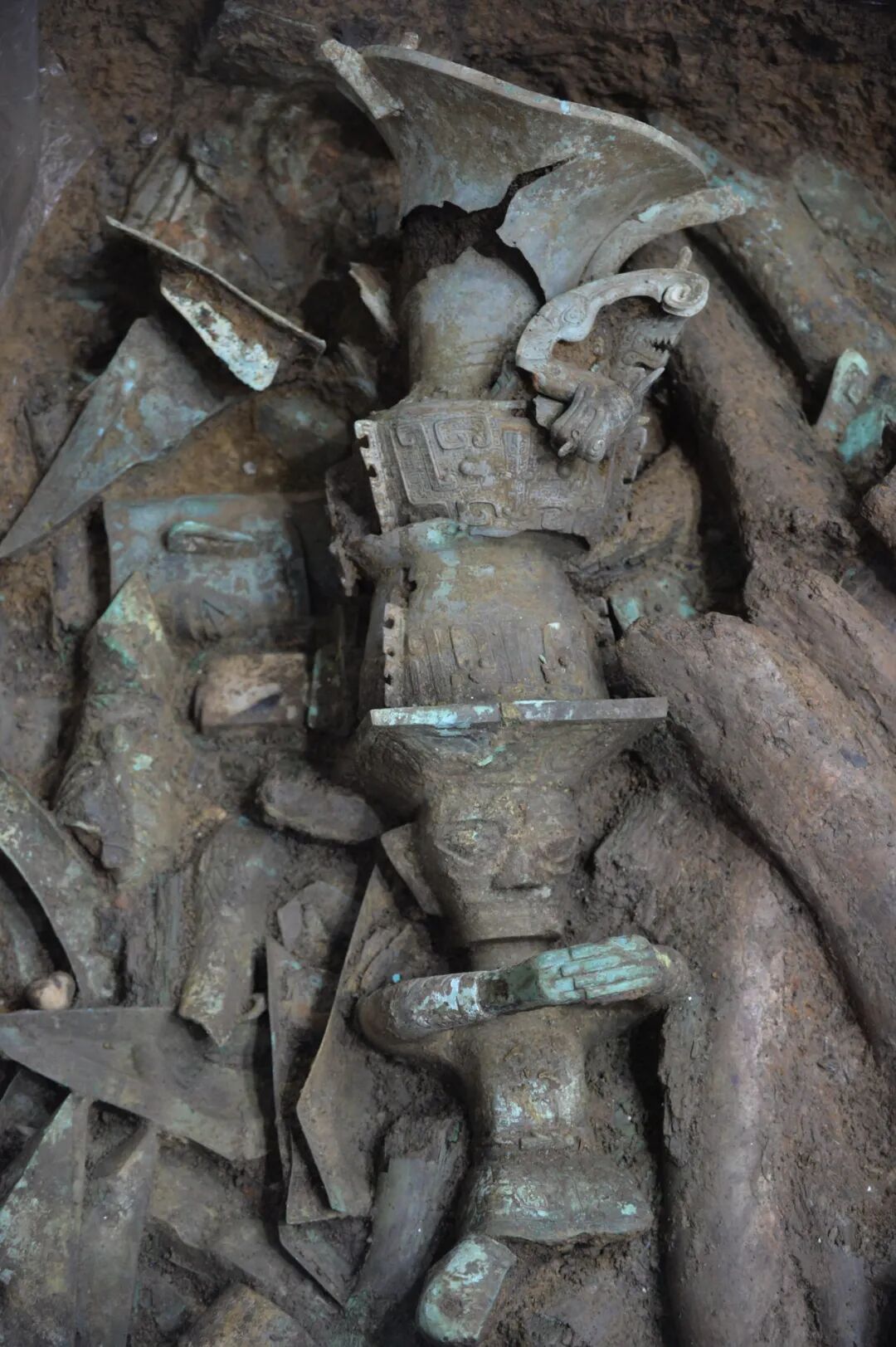 这是在三星堆考古发掘现场3号“祭祀坑”中新发现的青铜器(5月26日摄)。图片来源:新华社