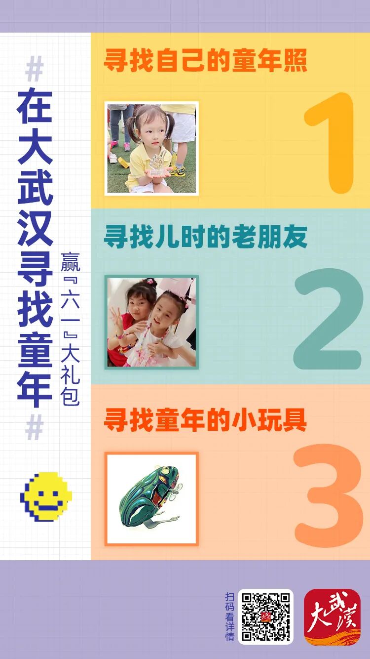 “六一”国际儿童节即将到来,即日起,大武汉客户端发起#在大武汉寻找童年#线上互动活动,您可以通过镜头,用照片、用视频,承载你的童年记忆,承载你儿时的美好,发布到“拍一拍”#在大武汉寻找童年#话题内,参与活动,就有机会赢得大武汉“六一”大礼包一份。详见>>>