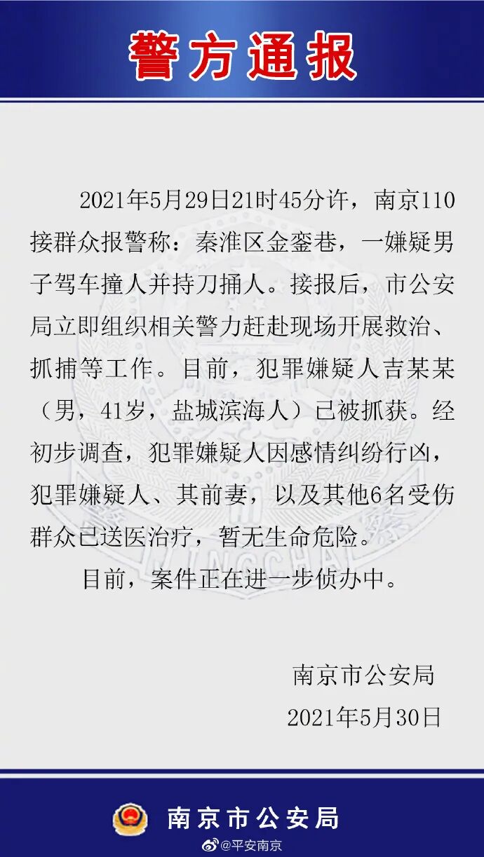 南京警方凌晨通报:男子因感情纠纷行凶,致前妻及其他6名群众受伤
