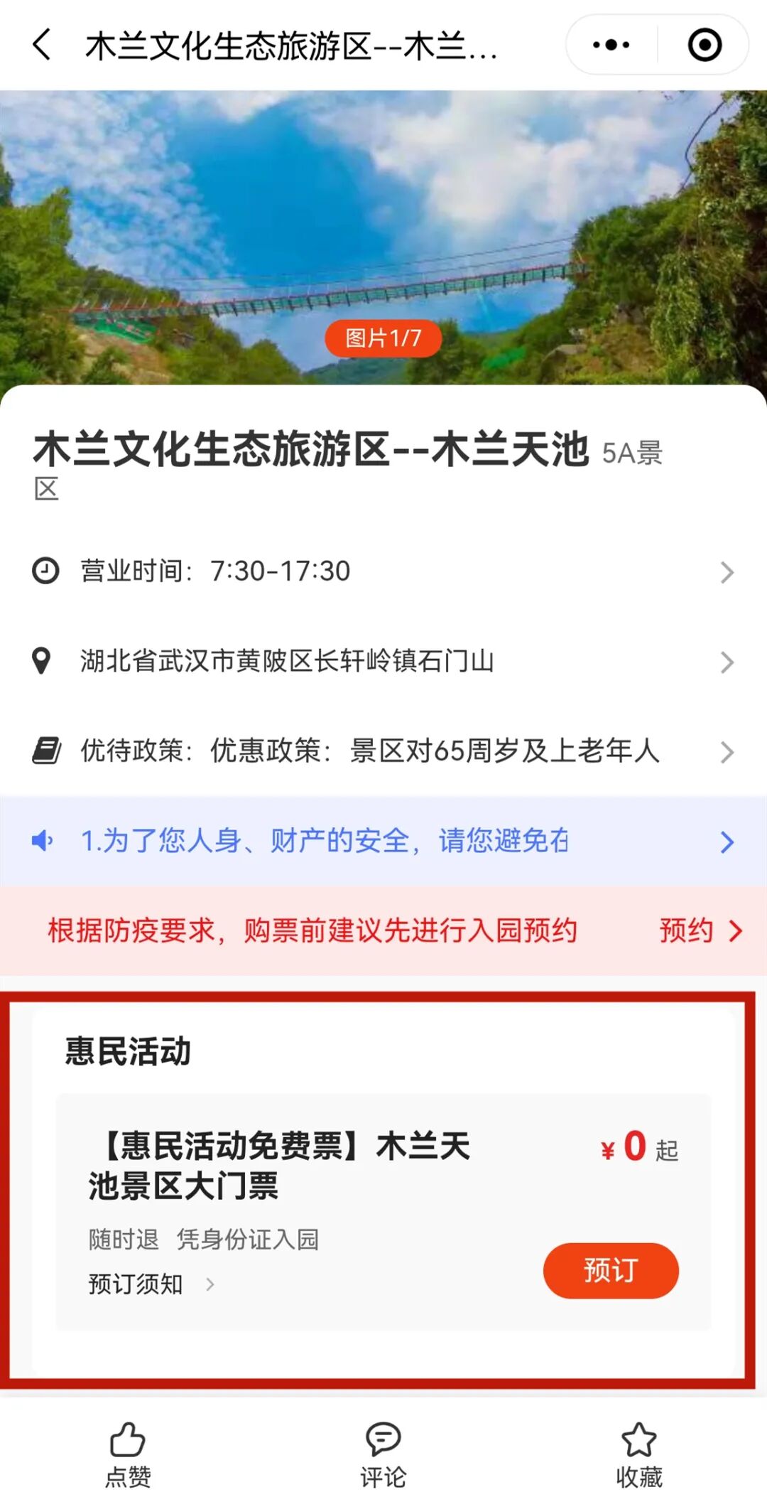 武汉木兰山、云雾山、花博汇每月都提供1000张免费门票,木兰天池则每月提供500张免费门票,并在9月30日前每周三对所有游客免门票。
