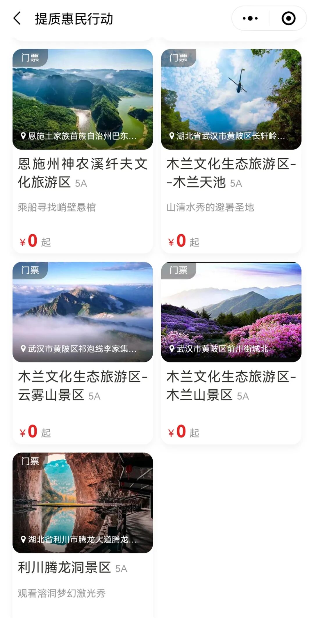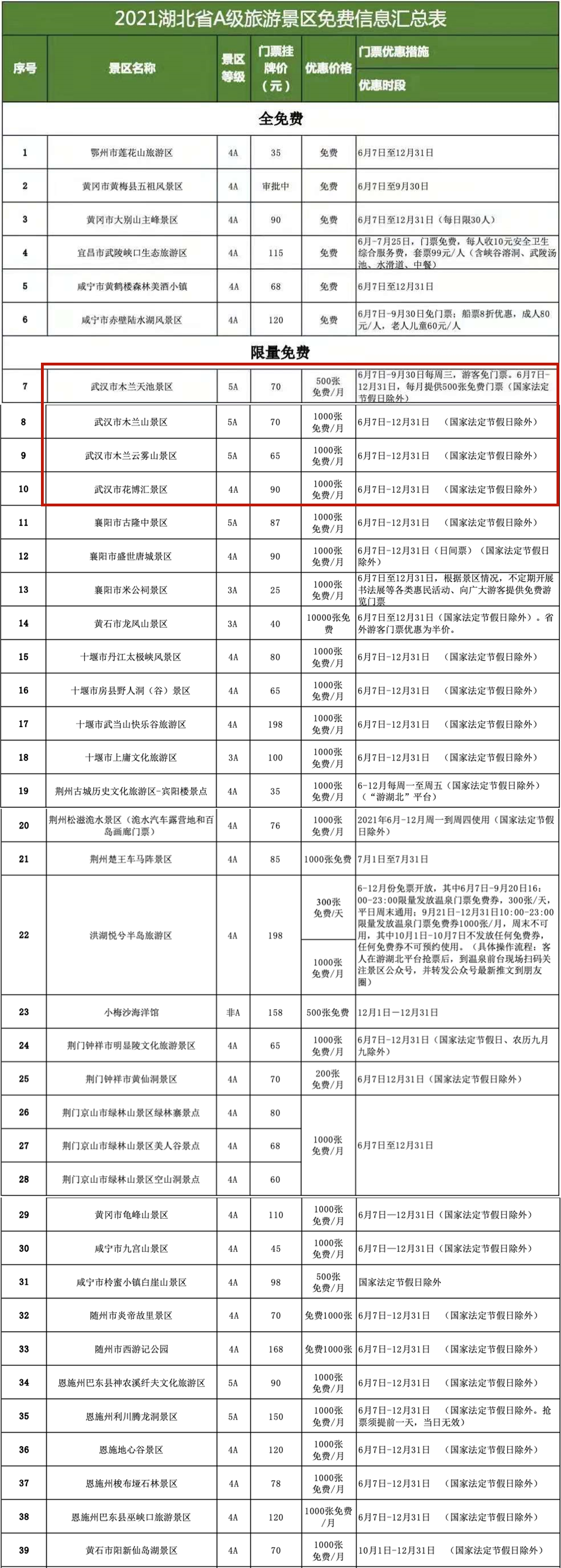 据介绍,目前湖北省A级旅游景区“提质惠民行动”中,全免费的景区共6家,全部为4A级景区;限量免费的景区有33家,包括6家5A级景区、23家4A级景区、3家3A级景区及1家非A级景区。