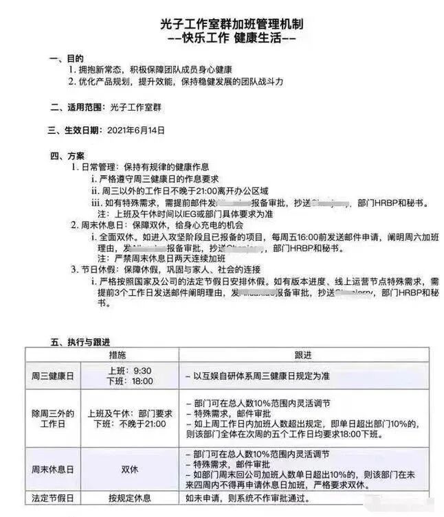 6月11日,“腾讯试点强制6点下班”的话题在社交平台冲上热搜,引发网友热烈讨论。从流出的加班管理机制表上看,自6月14日起,光子工作室将严格遵守周三健康日,周三早上9:30上班,18:00下班,其他工作日不晚于21:00离开办公区域。对此,部分网友评论羡慕这种福利,也有网友表示:“工作量没变的话,只是换个地方加班而已。”你如何看待?