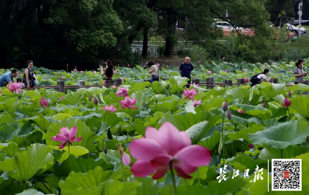 7月3日, 东湖磨山景区荷花池,不少市民前来欣赏方塘菡萏高的旖旎景色 。记者杨涛 摄