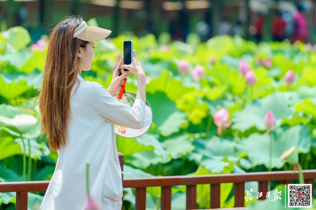 万亩连片盛放的荷花,成为江夏法泗街道夏天的主角,2021江夏第九届赏荷采莲推介会7日举办,众多市民游客来到红荷碧叶间拍照打卡。