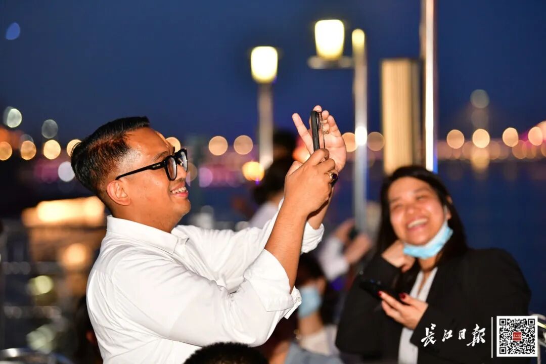 15日晚,来汉参加2021中国—东盟数字经济发展合作论坛的嘉宾登上长江游轮,欣赏武汉夜景。绚丽的灯光秀,流动的万家灯火,让外宾们连连赞叹。