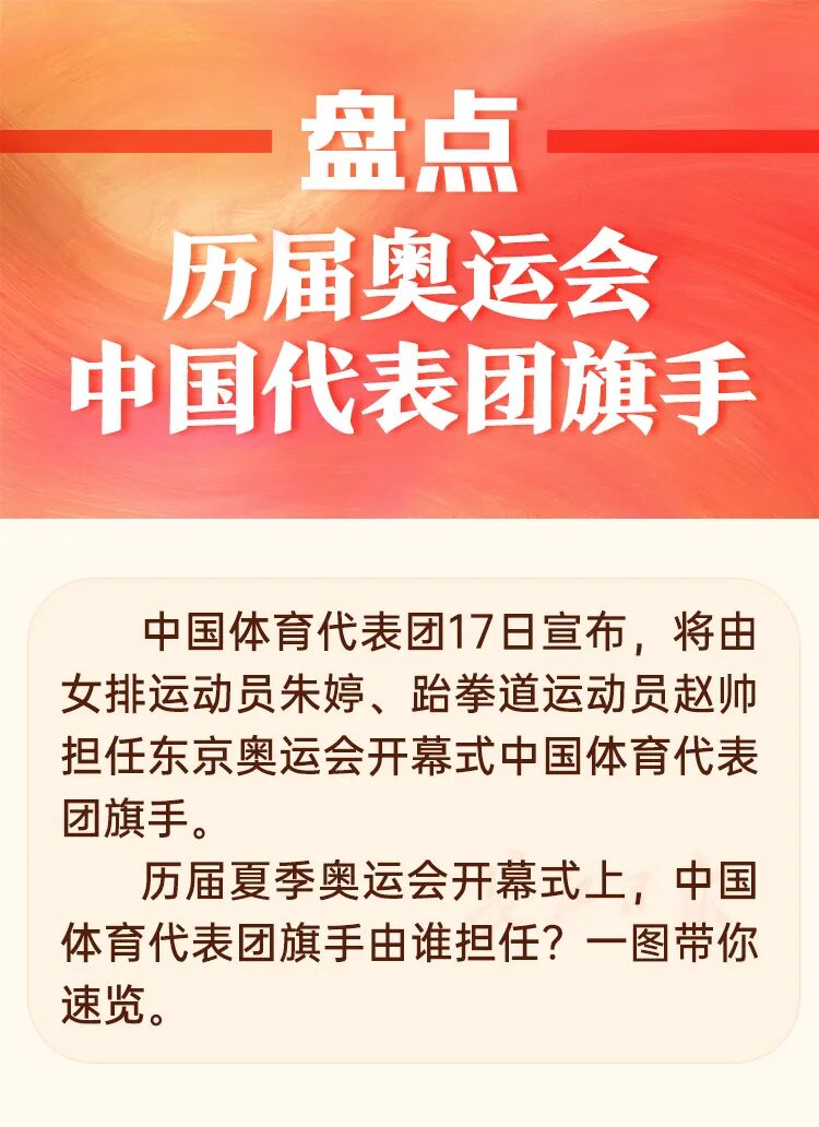 中国体育代表团17日宣布,将由女排运动员朱婷、跆拳道运动员赵帅担任东京奥运会开幕式中国体育代表团旗手。