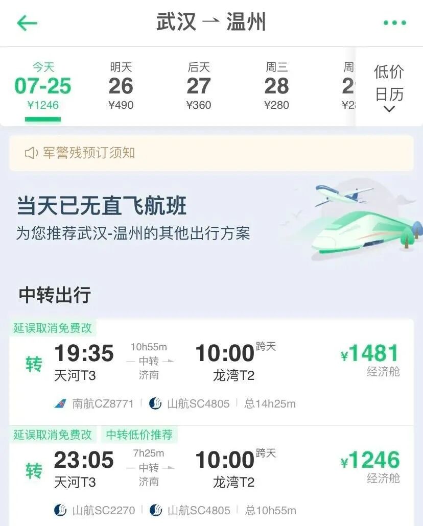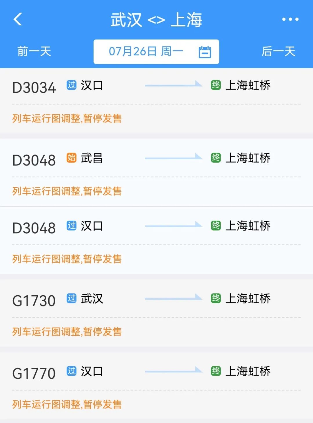 7月25日武汉出发的部分列车停运