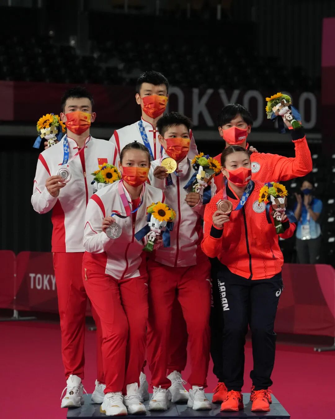 冠军中国选手王懿律(中后)/黄东萍(中前)、亚军中国选手郑思维(左后)/黄雅琼(左前)和季军日本队合影。图:新华社