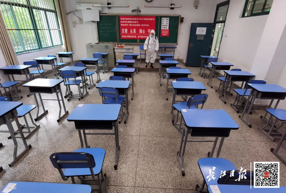 武汉市第六初级中学考点,专业人员对考场以及公共区域进行消杀。记者向洁 通讯员代建勇 摄