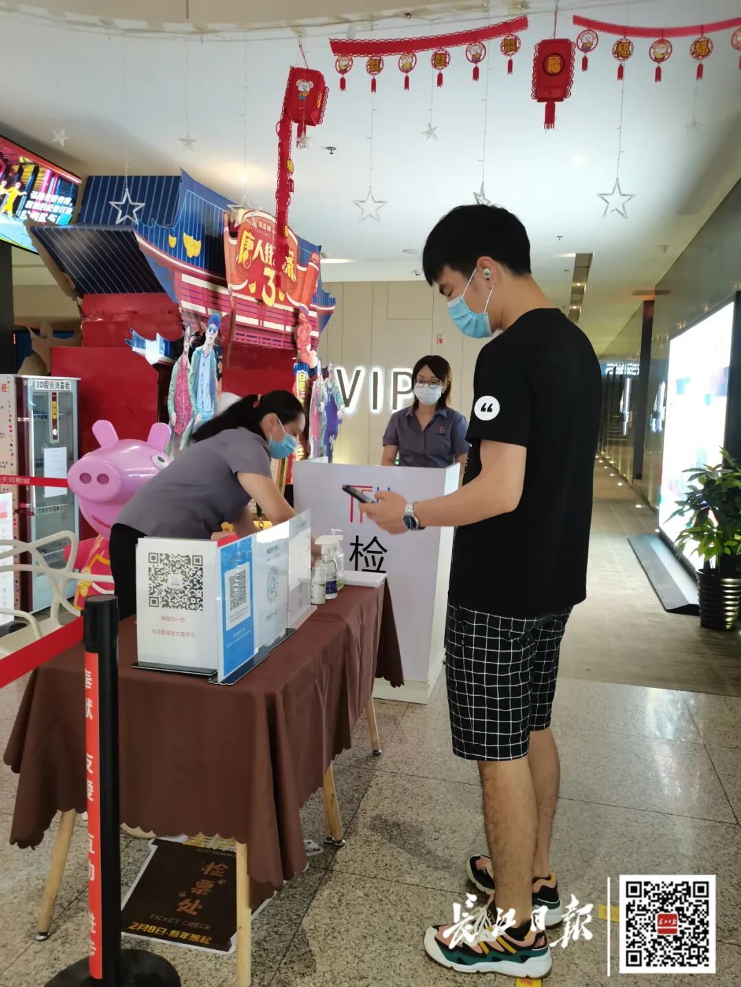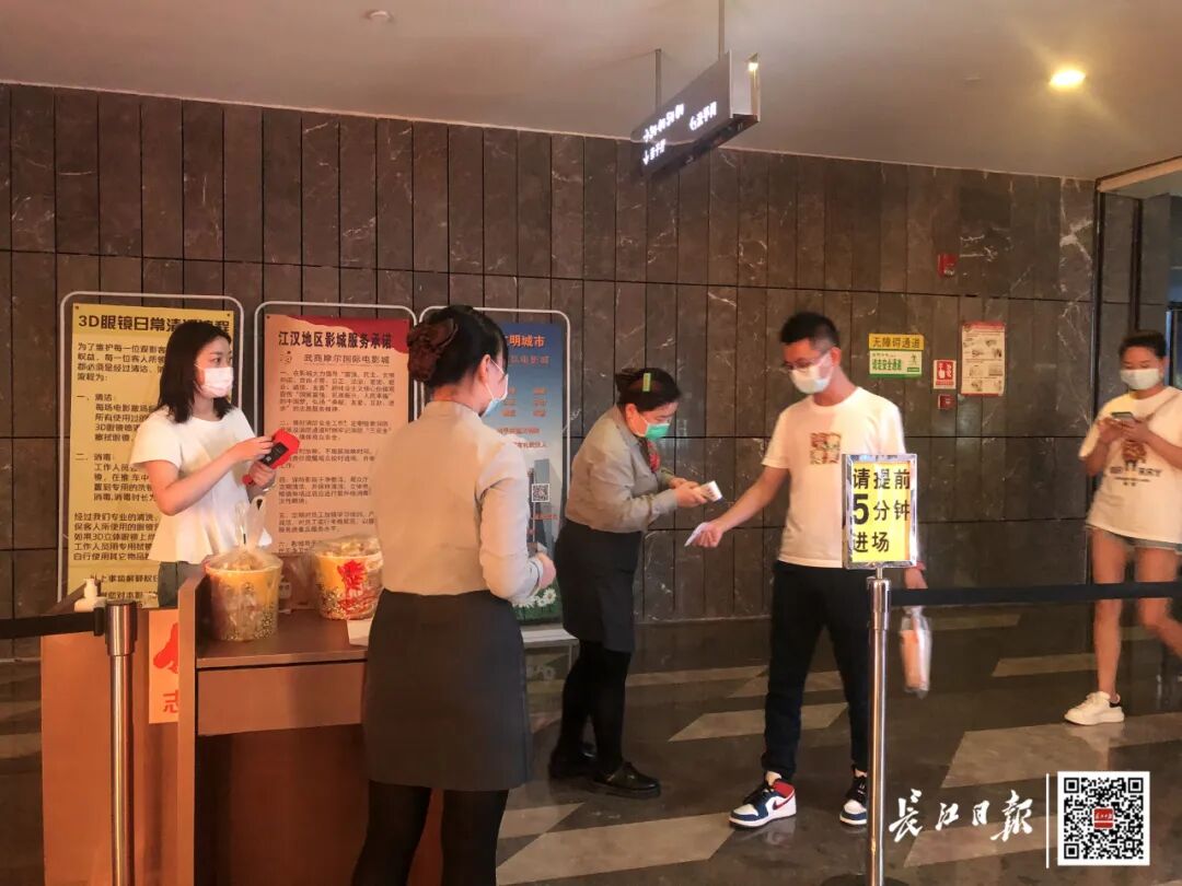 18时,汉阳天河国际影城迎来恢复开放后第一批观众,测体温、扫健康码、登记个人信息、手部消毒、按照地上标示的一米线排队,观众们在工作人员的指引下有序进入影厅。