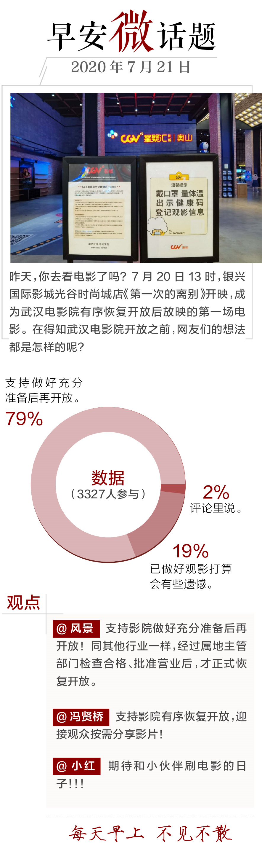 20日下午13时,长江日报记者来到银兴国际影城光谷时尚城店,直击武汉电影院有序恢复开放后的首场放映,多位观众在接受采访时都表示并不意外:“武汉很安全,我们走进电影院也很有安全感。”网友“时光电影台”说:“快乐的日子终于回来了!”