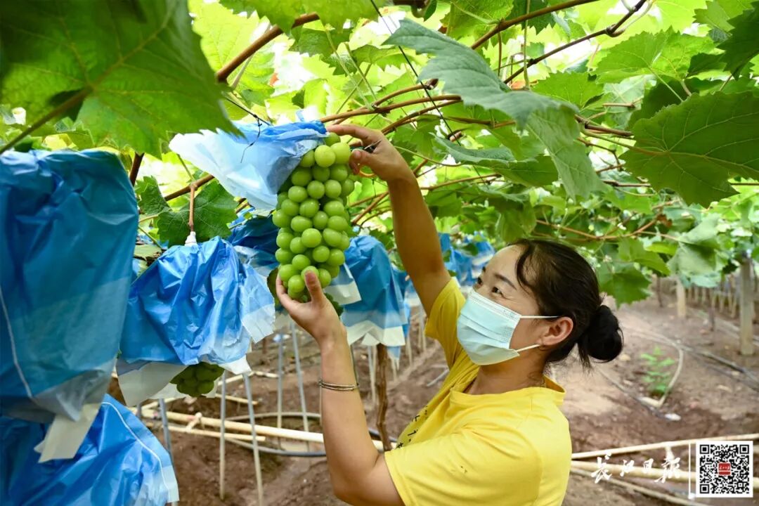 村民王芳正在采摘阳光玫瑰葡萄。记者金思柳 通讯员高国鹏 摄