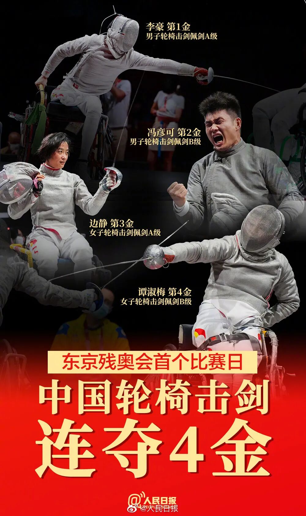 25日,东京残奥会首个比赛日,中国轮椅击剑队连夺四金。