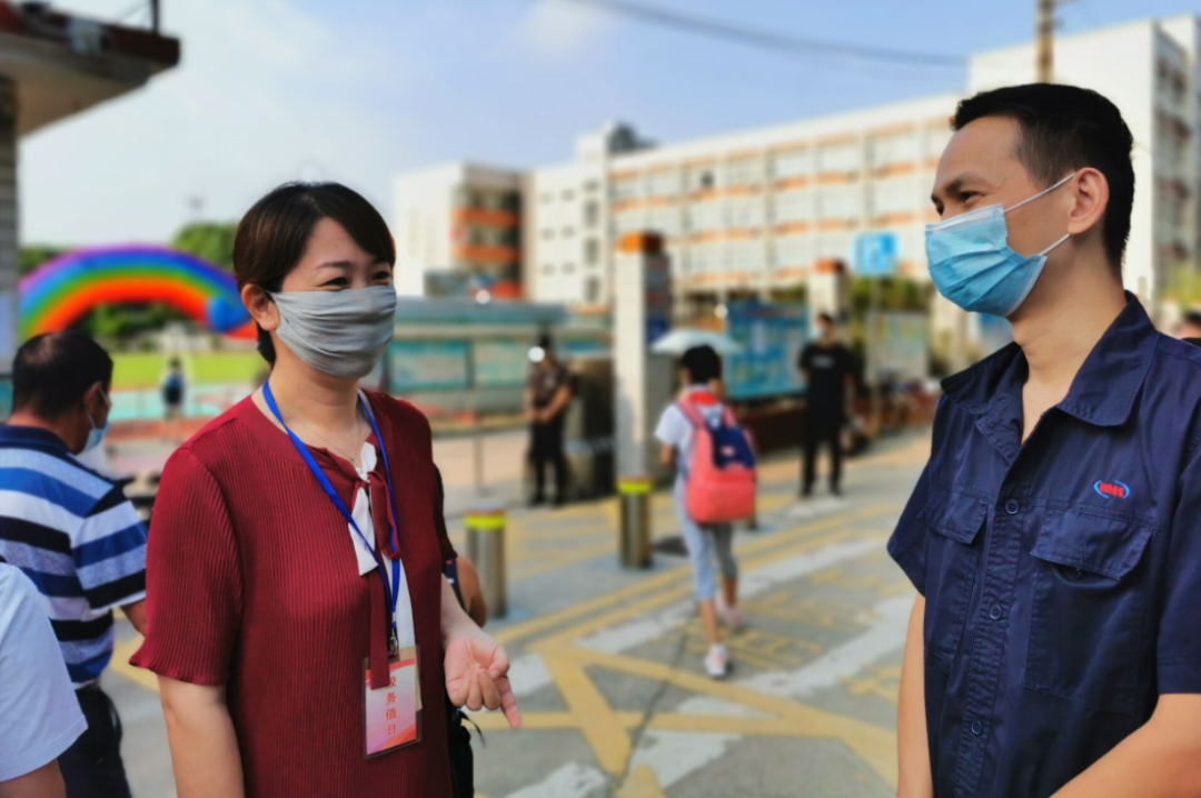 武东小学学生家长陈正中向副校长吴慧提课后服务建议。记者郭丽霞 摄