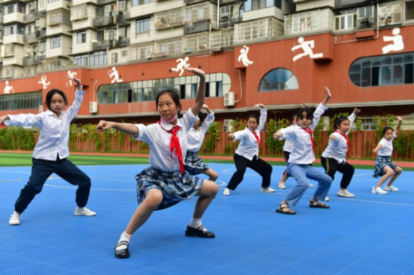 1日17时许,红钢城小学武术社团的学生在老师的带领下练习拳法。记者李永刚 摄
