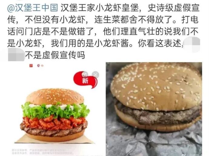 近日,福州张女士下单了一份汉堡王的新品小龙虾皇堡套餐外卖,大失所望,汉堡里面根本没有广告中诱人的小龙虾肉。店员称,汉堡里夹的是龙虾酱,酱里面有细小的龙虾肉。张女士对此很不满意。媒体随后联系到汉堡王,该餐厅表示将给张女士退单。