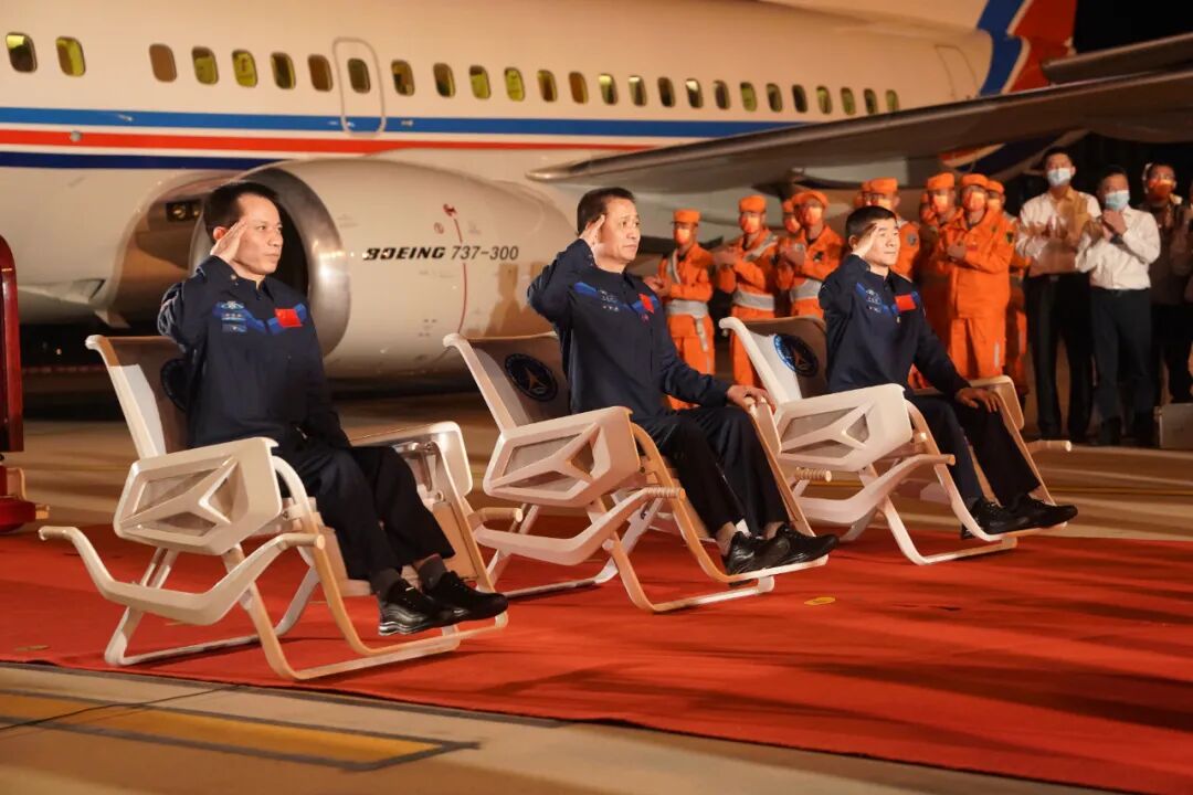 9月17日晚,聂海胜(中)、刘伯明(右)、汤洪波乘坐任务飞机平安抵达北京,现场敬礼。新华社记者郭中正 摄