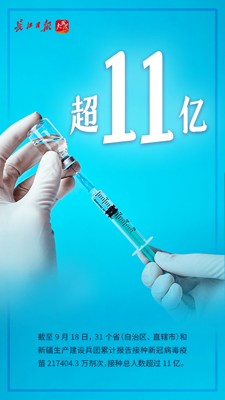 截至9月18日,31个省(自治区、直辖市)和新疆生产建设兵团累计报告接种新冠病毒疫苗217404.3万剂次,接种总人数超过11亿,接种总人数占全国总人口的78%。