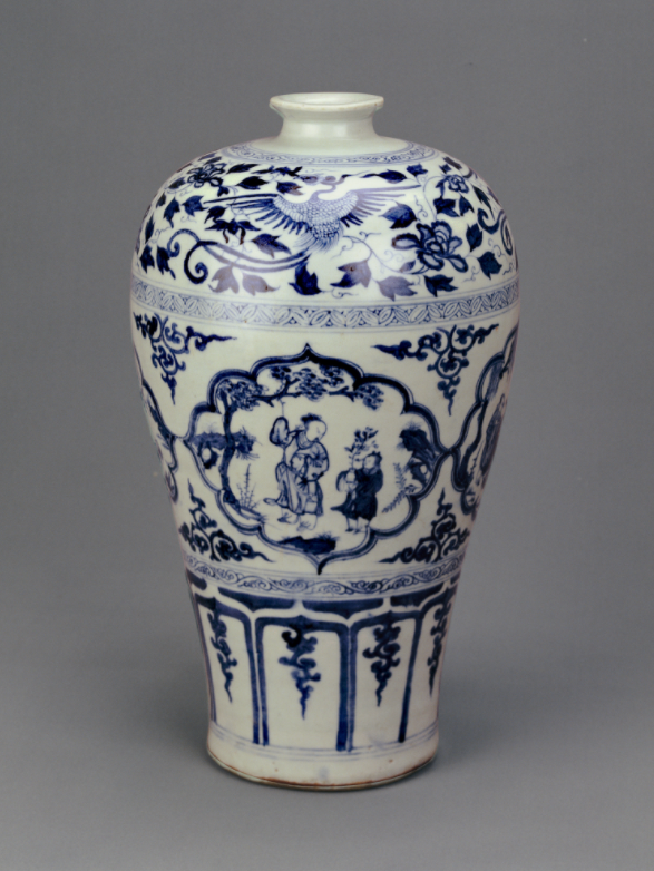 梅瓶小口外侈,短颈,丰肩,上腹圆鼓,下腹渐收,矮圈足,足微外撇。整体纹饰以卷草纹相间分为三组:于肩部绘凤穿牡丹纹,腹下部绘仰覆莲纹和忍冬纹一周,腹部主题纹饰为四处开光内,分别绘有四位高士闲情逸致之场景,即:王羲之爱兰,周敦颐爱莲,陶渊明爱菊,林和靖爱梅鹤,所绘人物形神兼备,特征鲜明,衣纹用笔潇洒自然。此器胎体厚重,造型秀美,色泽浓艳,是元代青花瓷中精品之作。