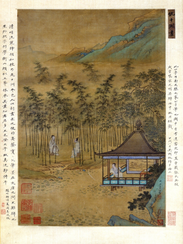仇英,明代著名画家、书法家,与沈周、文征明、唐寅并称为“明四家”。该画描绘了江南一隅的山水风光。画中绘青山、竹林、亭台、池塘,林中二士人相对而坐,亭中一翁持扇纳凉。用笔精细,形象逼真。右下侧题款“仇英实父制”。右上边有清末名臣张之洞手书“仇十洲画”题签。属国家一级文物。