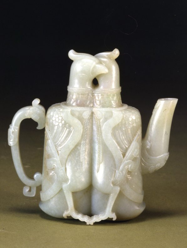 壶为白玉质,整体造型为两只凤鸟交颈相拥。以凤首为盖,紧紧相拥的凤鸟身构成了壶身,其上雕刻凤翅及凤羽,壶身下端两凤足相抵,壶底刻有“乾隆御制”填金篆书款。凤鸟作为吉祥的瑞兽,是古代器物中的重要纹饰,寄托着人们吉祥美好的寓意。此件器物造型雅致巧妙,工艺精湛细腻,纹饰柔美华丽,是乾隆时期玉雕中的精品之作。