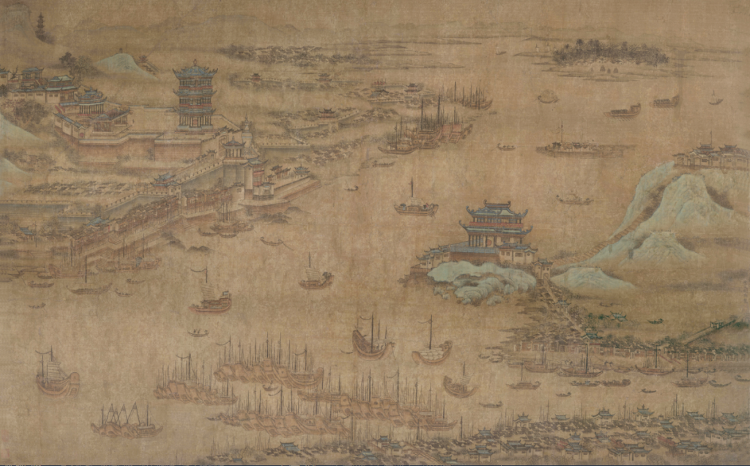 画面取长江与汉水交汇的水陆情境,巍巍黄鹤楼与晴川阁隔江对峙,江上千帆竞发,岸上屋舍鳞次栉比,城墙逶迤如龙。再现了当时武汉三镇的物事风貌。画面大气磅礴,结构严谨,景物繁而不杂,虚实结合,融艺术与写实于一炉。经考证此画的创作年代应为明代中期,题款为后人所加。属国家一级文物。