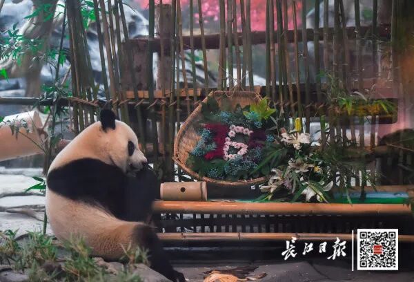 大熊猫在工作人员用花摆出的“365”数字前进食。记者许魏巍 摄 通讯员陈立云