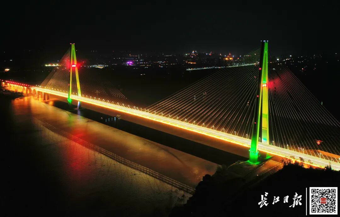 ◾ 赤壁长江公路大桥主塔采用“H”形设计,北主塔高217.33米,南主塔高223米,是世界跨度最大的钢混结合梁斜拉桥。赤壁长江公路大桥起于洪湖市乌林镇水府村,止于赤壁市赤壁镇普安村,全长11.2公里,其中长江大桥长3.35公里,主桥长1380米。全线采用双向六车道高速公路标准建设,设计时速100公里。